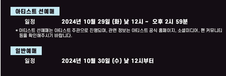 - 아티스트 선예매: 2024년 10월 29일 (화) 12:00 PM ~ 14:59 PM