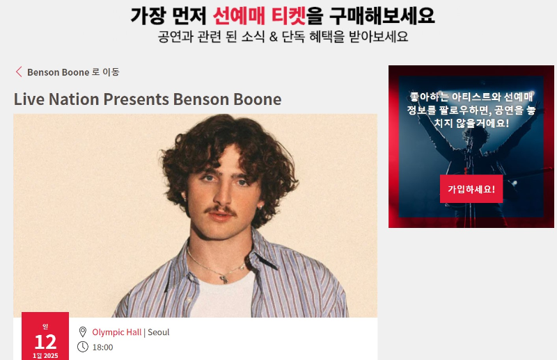 선예매 방법은 벤슨 분 공식 홈페이지에 가입하여 구독 신청을 하며 선예매 오픈 시간 전에 선예매 코드를 보내줍니다. 선예매 링크가 오픈되면 그 코드로 인증하고 티켓팅 진행하시면 됩니다.
