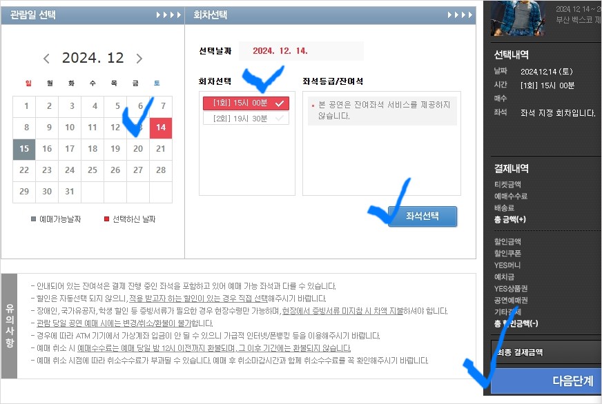 원하는 날짜와 회차를 빠르게 선택하고 다음단계 눌러줍니다.