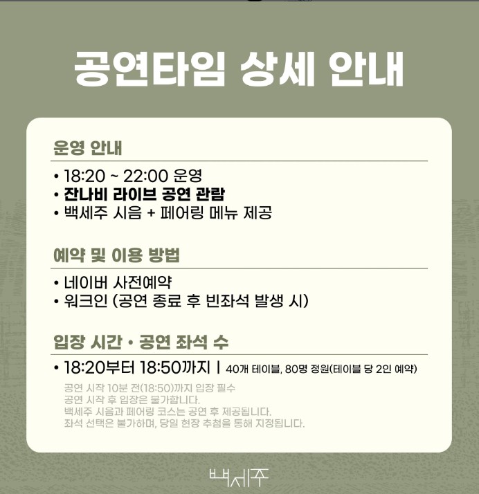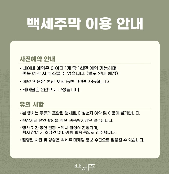 예약 방법: 네이버 지도에서 백세주막 팝업스토어를 검색하고 방문 날짜와 인원 수를 선택해 예약할 수 있습니다