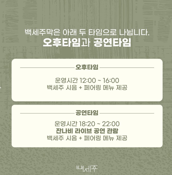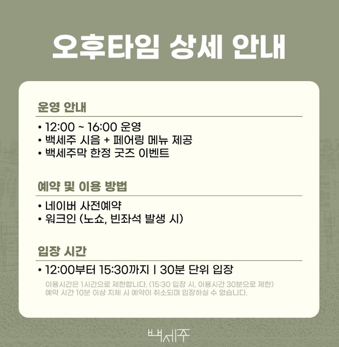 12:00 ~ 16:00 백세주 시음 및 페어링 메뉴 제공