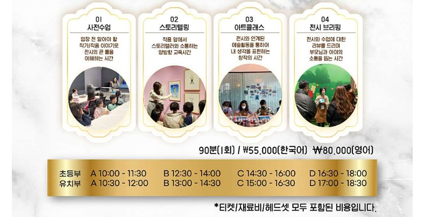 어린이들과 중고등까지 학생들을 위한 전시회 연계 공식 교육 프로그램도 진행될 예정입니다. <미술관 이야기>에서 진행하는 아트 스튜디오로 소수정예 프리미엄 미술관 교육입니다. 아이들 눈높이에 맞는 스토리텔링 수업으로 가장 장점은 프로그램을 신청 시 재입장이 가능합니다. 소수정예라 항상 티켓팅이 치열하니 아래 버튼 통해 미리 확인하시고 원하는 날짜 빠른 예약이 필수입니다.