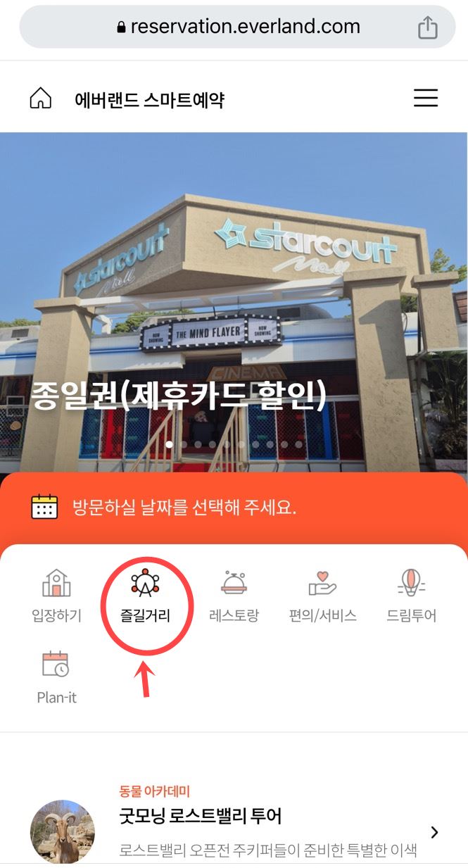 모바일의 경우 바로가기 버튼을 누르면 아래와 같이 에버랜드 스마트예약 페이지 초기화면으로 연결이 됩니다.