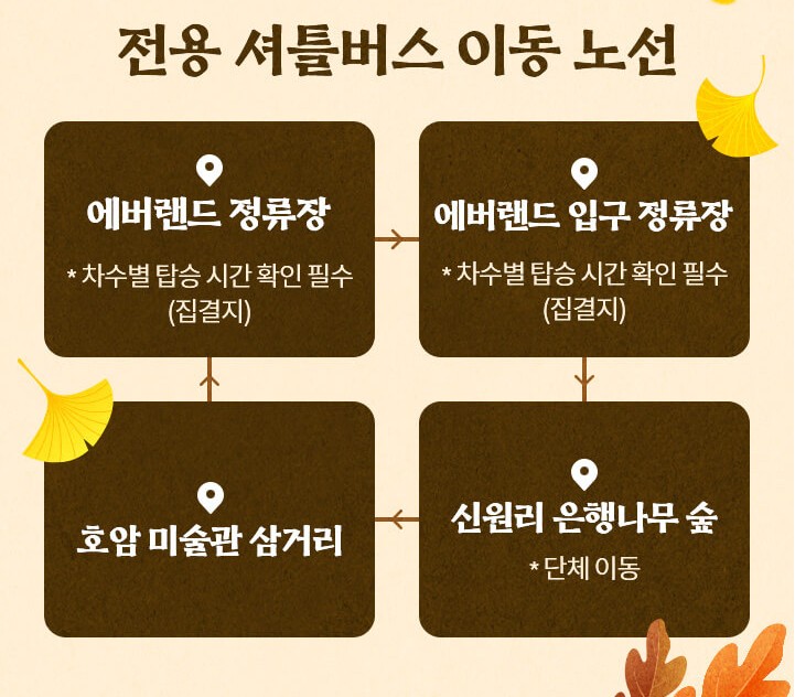 특별한 단풍여행 투어를 소개해 드리려고 합니다. 에버랜드가 지난 50년간 공개되지 않았던 비밀의 은행나무 숲을 일반에 공개합니다. 딱 9일만 하루 3회씩 진행하는 이 프로그램은 18일부터 티켓 오픈이 됩니다. 한정된 인원만 누릴 수 있는 특별한 경험, 선착순이니 아래 버튼을 통해 빠르게 예약하세요.