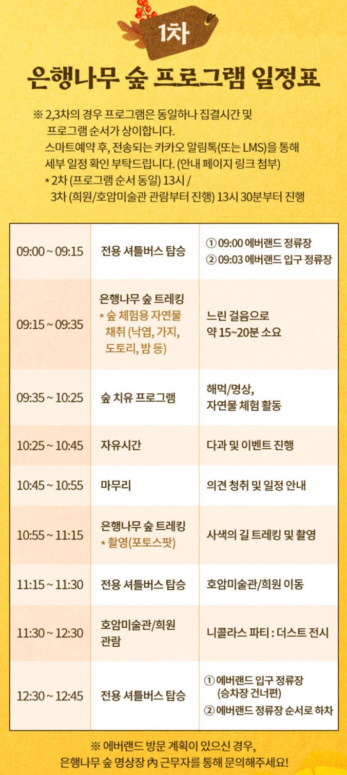 은행나무 길 트레킹과 숲 치유 프로그램 체험이 함께 진행되며 호암미술관의 기획전 <니콜라스 파티:더스트> 감상과 한국 전통정원인 희원 체험까지 할 수 있습니다. 총 프로그램에 소요되는 시간은 4시간 가량입니다. 에버랜드 종일권을 할인가로 구매가능 하다고 하니 함께 즐기시면 꽉 찬 가을 나들이를 완성할 수 있습니다.